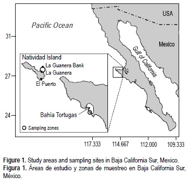 Este estudio se realizó en Isla Natividad (IN) y Bahía Tortugas (BT), BCS, México (fig. 1). Las zonas de muestreo fueron, en IN la localidad conocida como La Guanera (27°52' N, 115°09' W), y en BT, en Los Morros (27°39' N, 114°51'W y 27°42' N, 114°54' W), ambas localidades con sustrato arenoso, rocoso y grava.