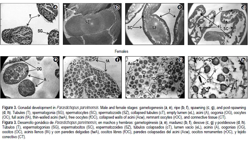 Con base en las observaciones morfológicas e histológicas se describieron e identificaron cinco estadios de desarrollo para P. parvimensis de ambos sexos y áreas: indiferenciado, gametogénesis (desarrollo), madurez, desove y post-desove. En la figura 3(a-h) se presentan los cinco estadios observados para hembras y machos.