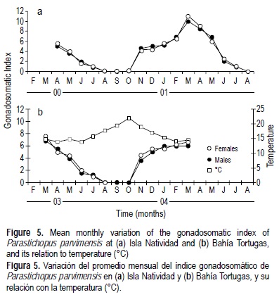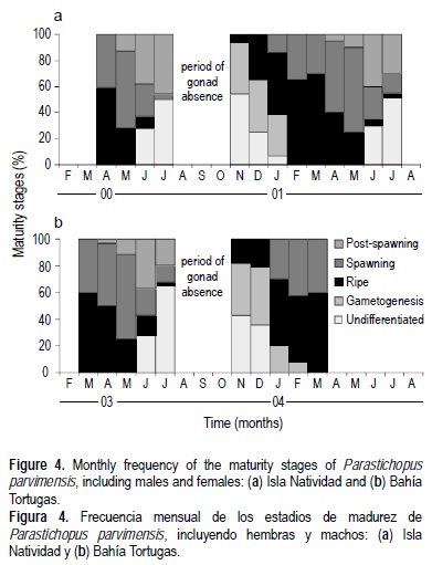 El ciclo reproductor de P. parvimensis en ambos sitios presentó un patrón anual para ambos sexos. El evento reproductor inició con la fase de gametogénesis, con máximos porcentaje de organismos en este estadio en IN y BT en noviembre (44% y 38%, respectivamente) y diciembre (40% y 43%, respectivamente) (fig. 4a, b). En IN los máximos porcentajes de madurez se presentaron en abril (59%) de 2000, y febrero (65%) y marzo (70%) de 2001, mientras que en BT, sucedieron en marzo (60%) y abril (50%) de 2003, y en febrero (50%) y marzo (60%) de 2004 (fig. 4a, b). En ambas localidades el máximo desove se detectó en abril y mayo: en IN el porcentaje más alto fue en abril (55%) y mayo (59%) de 2000, y en mayo (65%) de 2001, mientras que en BT éste fue en mayo (65%) de 2003 (fig. 4a, b). El máximo post-desove tanto en IN como en BT ocurrió en junio (30-45%) y julio (30-40%) (fig. 4a, b), resultando el fin del periodo reproductivo. De agosto a octubre en ambas zonas no se registraron estadios gonádicos debido a que los individuos encontrados en estos meses no tenían gónada (fig. 4a, b). En estos meses los organismos evidenciaron también la ausencia y/o atrofia estacional de otros órganos internos (tracto digestivo, aparato circulatorio, etc). En noviembre los especímenes presentaron regeneración de órganos internos y gónada, marcando el reinicio el ciclo.