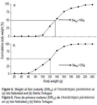 El peso de primera madurez sexual (BW50, por sus siglas en inglés) se obtuvo utilizando las frecuencias acumuladas relativas del PC (Conand 1993a) de los individuos maduros (estadios III y IV).