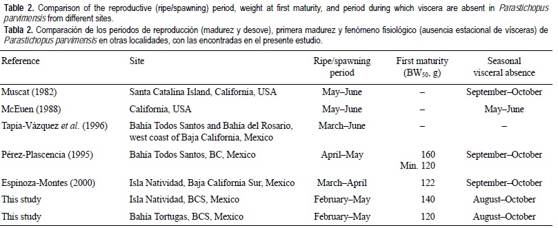 En la tabla 2 se compara el periodo de madurez y desove registrado para P. parvimensis en este estudio, con los registrados por otros investigadores en otros sitios. Se aprecia que la época de reproducción de esta especie presenta un gradiente latitudinal de sur a norte. En la zona sur el periodo de madurez/ desove es en invierno/primavera mientras que en el norte es en primavera/verano. Este gradiente probablemente se debe a las condiciones oceanográficas, a factores ambientales, a la latitud o a la distribución geográfica. Cameron y Fankboner (1986) indican que muchos holotúridos desovan en respuesta al incremento en la intensidad del régimen de luz ambiental, como P. californicus, que inicia su desove con el incremento de la duración e intensidad de la luz del día, lo que implica el incremento de la biomasa de fitoplancton, factores que pueden ser los posibles inductores del desove latitudinal. Pérez-Plascencia (1995) y Espinoza-Montes (2000) registraron que estos factores inducen el desove de P. parvimensis en Bahía Todos Santos y en IN, por lo que se considera que éstos podrían también ser los inductores de desove en IN y BT, pero ésto no fue evaluado.