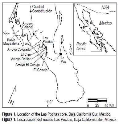 Las rocas sedimentarias de la formación Tepetate provienen de un núcleo perforado en los alrededores del poblado de Las Pocitas, localizado aproximadamente 76 km al sur de Ciudad Constitución, en el Municipio de La Paz, BCS (UNAM Loc. 2984; 24°24'00" N, 111°05'47" W, Carta Las Pocitas, Baja California Sur, México, 1:50,000, G12C79, CGSINEGI 1983; fig. 1). La perforación de 80 m fue realizada por la Secretaría, de Recursos Hidráulicos, de la que se recuperaron 62 m de rocas sedimentarias, representadas en su mayoría por un paquete homogéneo de limolita gris clara de grano fino, fosilífera, de 51 m de espesor. A su vez, la limolita se encuentra cubierta por estratos delgados de arenisca y caliza (fig. 2).