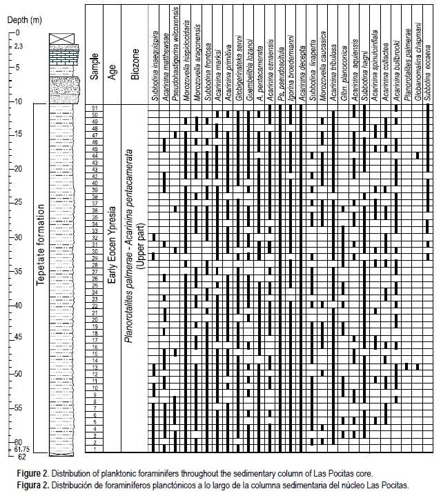 Tomando en cuenta el alcance estratigráfico de todas las especies de foraminíferos planctónicos recuperadas en el núcleo Las Pocitas, el conjunto indica una edad paleógena (fig. 6). Más aún, con excepción de Acarinina tribulosa Bolli, A. decepta, A. aquiensis Loeblich y Tappan, A. esnaensis Le Roy, A. marksi Martin, A. collactea (Finlay), Morozovella hispidicidaris Martin, Globonomalina chapmani (Parr), G. planoconica (Subbotina), Subbotina linaperta (Finlay) y S. inaequiespira Subbotina, cuyos alcances estratigráficos comienzan en el Paleoceno, y de Subbotina eocaena (Guembel), que llega hasta el Oligoceno, el conjunto en su totalidad puede ser situado en el Eoceno (fig. 6).