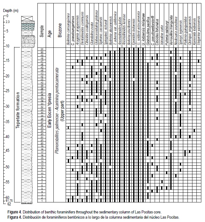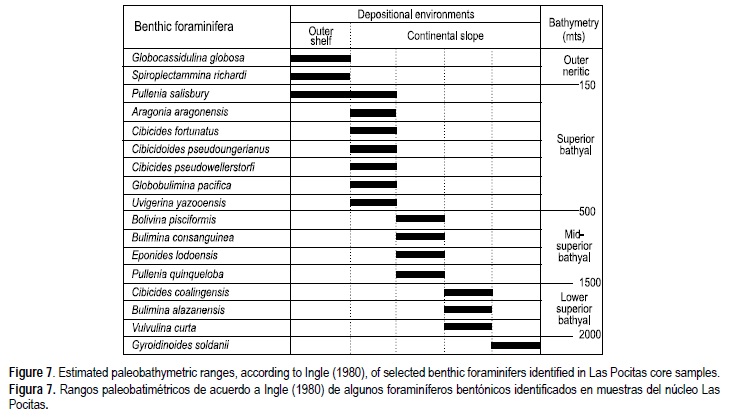 Las especies de foraminíferos bentónicos identificadas en las rocas pertenecientes a la formación Tepetate como Spiroplectammina richardi Martin y Globocassidulina globosa Hantken, son, de acuerdo con Ingle (1980), parte de un conjunto característicamente nerítico externo, al igual que Pullenia salisburyi (Stewart y Stewart) que incluso se presenta en biofacies del batial superior (Smith 1964). Los rangos paleobatimétricos más profundos pertenecen a Vulvulina curta Cushman y Siegfus, Cibicides coalingensis (Cushman y Hanna) y Bulimina alazanensis Cushman, con límites superiores de profundidad en el batial medio inferior, y Gyroidinoides soldanii en el batial inferior a lo largo de la margen oriental del Pacífico. Sin embargo, los taxones bentónicos más abundantes, bien preservados y de mayor frecuencia como Aragonia aragonensis (Nuttall), Cibicides fortunatus Martin, Cibicidoides pseudoungerianus Cushman, Cibicides pseudowellerstorfi Cole, Globobulimina pacifica (Cushman) y Uvigerina yazooensis Cushman, son especies comunes en el batial superior (Ingle, 1980). Otras especies dominantes asociadas a este conjunto tienen límites de profundidad en el batial medio superior como son Eponides lodoensis Martin, Bolivina pisciformis Galloway y Morrey, junto con Bulinina consanguinea Parker y Bermudez y Pullenia quinqueloba (Reuss). Esta asociación faunística sugiere que los sedimentos de la formación Tepetate en el núcleo Las Pocitas se depositaron entre el batial superior y medio superior, aproximadamente a 500 m de profundidad, en un ambiente del talud continental (fig. 7).