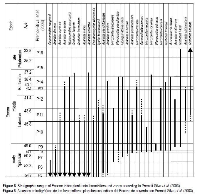 Este conjunto de especies eocénicas distribuidas en toda la columna sedimentaria de Las Pocitas, con excepción de Acarinina spinuloinflata Bandy y Subbotina eocaena, puede representar un conjunto equivalente al de la Zona P9 Planorotalites palmerae-Acarinina pentacamerata de Premoli-Silva et al. (2003). De acuerdo a estos autores, la Zona P9 Planorotalites palmerae-Acarinina pentacamerata se define como el intervalo bioestratigráfico entre el DPA (datum de primera aparición) de Planorotalites palmerae (Cushman y Bermúdez) y el DPA de Hantkenina nuttalli Toumarkine, y está caracterizada, por la abundancia de Acarinina pentacamerata (Subbotina) y la coocurrencia de Subbotina frontosa (Subbotina), S. inaequispira Subbotina, Morozovella aragonensis (Nuttall) y Acarinina bullbrooki Bolli, especies todas presentes en la columna sedimentaria estudiada. Más aún, la presencia continua de Acarinina mathewsae Blow y Subbotina hagni Gohrbandt en las muestras estudiadas, que según Premoli-Silva et al. (2003) tienen su DPA en la parte superior de la Zona P9 Planorotalites palmerae-Acarinina pentacamerata, refuerza la afirmación de que toda la columna estratigráfica se depositó durante la parte superior de esta zona (fig. 6).