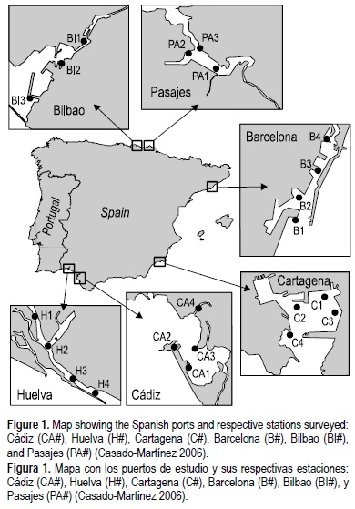 Para realizar este estudio se seleccionaron 22 muestras de sedimento de seis puertos localizados en el norte y sur de España (fig. 1): B1, B2, B3 y B4 en Barcelona, puerto de gran importancia para el transporte marítimo; BI1, BI2 y BI3 en Bilbao, localizado en las proximidades de industrias del metal; PA1, PA2, PA3 en Pasajes, puerto caracterizado por la contaminación orgánica de sus sedimentos; H1, H2, H3 y H4 en Huelva, donde destaca la presencia de metales; C1, C2, C3 y C4 en Cartagena, influenciado por fuerte actividad minera en las últimas decadas; y CA2, CA3 y CA4 en Cádiz, con ausencia de fuentes de contaminación destacables. Se utilizó como referencia sedimento de una zona de la bahía de Cádiz (CA1) que presentaba baja contaminación y ausencia de toxicidad en estudios previos con otros organismos (Riba et al. 2003).