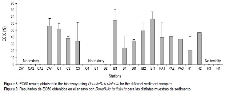 En la figura 3 se muestran los resultados de EC50 obtenidos en los ensayos de toxicidad con Dunaliella. Algunos de los tratamientos no mostraron toxicidad sino que se observó una inducción considerable del crecimiento de la población, en concreto CA1 y CA2 (Cádiz), B1 y B2 (Barcelona) y H3 (Huelva). Tampoco se observó toxicidad en las poblaciones de microalga expuestas a los sedimentos de CA3 (Cádiz), C4 (Cartagena) y H4 (Huelva). Por otra parte las muestras C2 (Cartagena), B4 (Barcelona), BI1 (Bilbao), PA3 (Pasajes) y H1 (Huelva) mostraron los valores más bajos de EC50, es decir una mayor toxicidad.