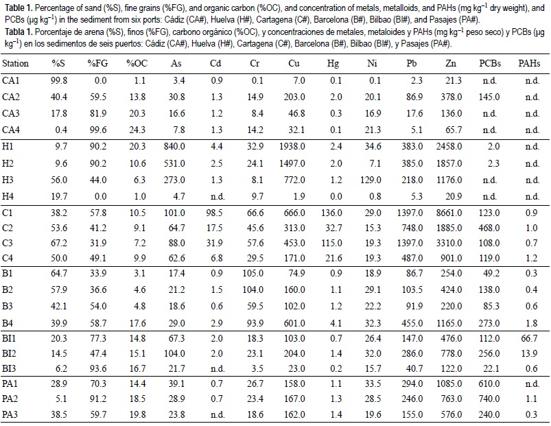 La estación CA1 seleccionada en el saco interno de la bahía de Cádiz presentó los niveles más bajos de metales y ausencia de contaminación orgánica (tabla 1). Por otro lado, las estaciones CA2, CA3 y CA4 presentaron un tamaño de grano variable (59-99%) y un mayor contenido en carbono orgánico (13.824.3%). El puerto de Huelva se encuentra en la Ría de Huelva, formada en el estuario de los ríos Tino y Odiel, y se caracteriza por una gran contaminación metálica debido a la proximidad de la Faja Pirítica Ibérica (Casado-Martínez 2006). Los sedimentos de las estaciones de Huelva (H#) presentaron altos niveles de contaminación por metales, especialmente de Cu (1.9-1938 mg kg-1), Zn (20.9-2458 mg kg-1), Ni (0.8-34.6 mg kg-1) y el metaloide As (4.7-840 mg kg-1). Sin embargo, los puntos de muestreo de Cartagena (C#) presentaron una mayor concentración en metales (e.g., Cd: 6.8-98.5 mg kg-1, Hg: 21.6-136 mg kg-1, Pb: 487-1397 mg kg-1, Zn: 901-8661 mg kg-1) ya que además de su intensa actividad marítima, el puerto se ha visto influenciado por las actividades industriales relacionadas con la minería desarrollada en la zona durante décadas. Por otra parte los puertos de Bilbao (BI#), Pasajes (PA#) y Barcelona (B#), en el norte de España, presentaron una importante concentración de contaminantes orgánicos en sus sedimentos (PCBs: 49.2-273, 22.1-256 y 240-740 μg kg-1 en Barcelona, Bilbao y Pasajes; PAHs: 0.3-1.8, 0.6-66.7 y n.d-1.1 mg kg-1 en Barcelona, Bilbao y Pasajes, respectivamente) debida a la actividad marítima y/o pesquera que en ellos se desarrolla.