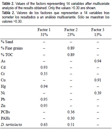 A partir de los resultados obtenidos se calculó EC50 mediante Probit-Analysis-Program, versión 1.5. Los resultados de los análisis fiscoquímicos del sedimento y los valores de toxicidad fueron normalizados para realizar un análisis de factores. El objetivo era explicar de forma simple y gráfica las relaciones observadas entre un número inicial de variables utilizando un número menor de factores, mediante el método de componentes principales (PCA).