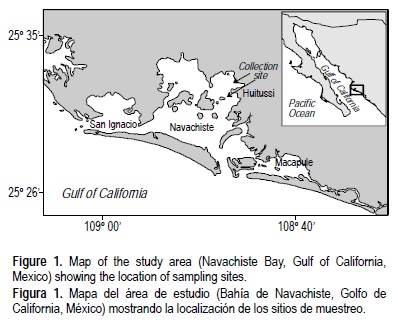 En mayo de 2004 se recolectaron a mano plantas de Gracilariopsis longissima y Gracilaria vermiculophylla de poblaciones naturales que se encuentran en la Bahía de Navachiste, en la costa suroeste del Golfo de California (fig. 1). Las poblaciones de G. longissima se desarrollan bien en áreas lodosas de poca profundidad (1 a 1.5 m de profundidad) en la parte interior de la bahía. Las plantas crecen parcialmente enterradas en el sustrato, fijas a rocas pequeñas o fragmentos de conchas de moluscos. La mayor parte de las plantas recolectadas sobrepasaron 1 m de longitud y su diámetro no fue mayor a los 3 mm. Las algas presentaban abundantes prolongaciones cortas y su coloración era verde oscuro. En contraste, las poblaciones de G. vermiculophylla crecen fijas a las rocas que se encuentran alrededor de las islas localizadas al interior de la bahía desde la zona intermareal baja hasta una profundidad de aproximadamente 3 m. Las plantas con abundantes ramificaciones son de consistencia cartilaginosa, de 0.3 a 0.5 m de longitud y color verde a púrpura. Las macroalgas recolectadas fueron colocadas dentro de bolsas de plástico con agua de mar y fueron transportadas de inmediato en hieleras de plástico al laboratorio. A su llegada al laboratorio las plantas fueron enjuagadas con agua de mar para eliminar partículas de sedimento y epífitas, y luego se enjuagaron con agua dulce; posteriormente se sumergieron en una solución de formaldehído al 10% por 24 h para prevenir la hidrólisis enzimática del agar (Freile-Pelegrín y Robledo 1997), se enjuagaron con agua de la llave, se secaron al sol por 8 h y posteriormente se colocaron en un horno a 70°C para su secado hasta obtener peso constante. Entonces, las algas se colocaron en bolsas de plástico selladas herméticamente y se mantuvieron a temperatura ambiente en el laboratorio hasta el inicio de la extracción.
