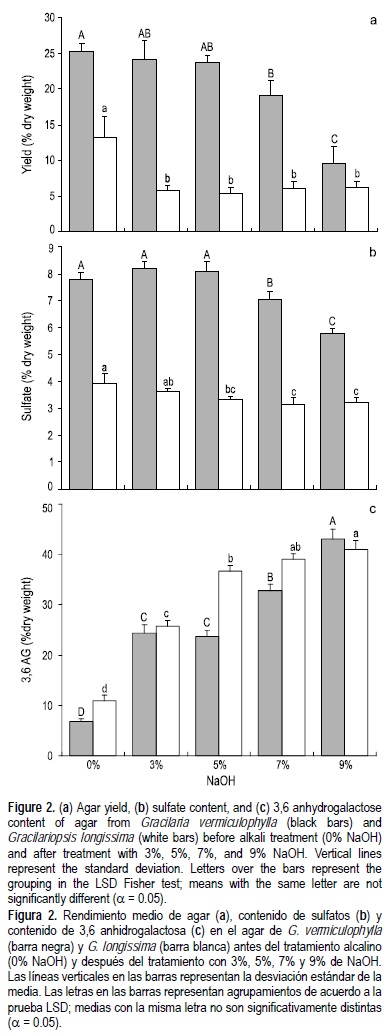 Por otra parte, se ha sugerido que el pretratamiento de las algas con soluciones alcalinas puede mejorar la fuerza de gel del agar obtenido por la acción que éste tiene en la eliminación de los residuos de sulfato de la molécula de agar. No obstante, no todos los residuos de sulfato pudieran ser residuos lábiles; por tanto, mientras mayor sea la cantidad de residuos no lábiles al tratamiento alcalino, menor será la fuerza de gel del agar resultante (Craigie y Wen 1984). En este trabajo se observó que el contenido de sulfatos en G. vermiculophylla pudo ser reducido sólo en los tratamientos con mayor contenido alcalino (7% y 9% de NaOH); a pesar de ello, la cantidad remanente de sulfatos presente en el agar extraído fue demasiado alta para mejorar sustancialmente la fuerza de gel, como ocurre en otras especies de Gracilaria. Por el contrario, para G. longissima se observó una reducción significativa en el contenido de sulfatos en el agar obtenido del tratamiento con 5% de NaOH, y no se observó ninguna disminución significativa (prueba LSD) al aumentar la concentración de álcali. Esto sugiere que los residuos de sulfato que persisten en el agar de esta especie son menos susceptibles de ser eliminados aun por los tratamientos alcalinos de mayor concentración debido probablemente a su posición no lábil.