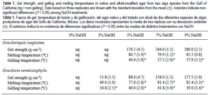 Se ha mencionado que la presencia de residuos estables al tratamiento alcalino de D-galactosa-6-sulfato, y parcialmente de 4-0-metil-a-L-galactosa, fue la responsables de la extremadamente pobre capacidad de gelificación y baja fuerza de gel (< 50 g cm-2) en el agar nativo y agar tratado de Gracilaria cervicornis (Freile-Pelegrín y Murano 2005). Además, la presencia de esteres de sulfato estables al tratamiento con álcali y la de acetal piruvatos disminuyen la fuerza de gel (Wilson y Critchley 1998). De modo similar se ha mencionado que el tratamiento alcalino puede causar un rompimiento de la cadena de agar, dando como resultado una fuerza de gel baja (Murano et al. 1992). Esto podría indicar que la baja fuerza de gel observada en el agar extraído de las plantas del Golfo de California podría ser debida a un alto contenido de residuos de sulfato estables al tratamiento alcalino aún después de aplicar soluciones con alto contenido de NaOH, lo que también sugiere un posible rompimiento del agar después del tratamiento con alta concentración alcalina.