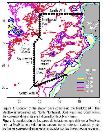 Se definió una caja de tres lados alrededor del Estrecho de Gibraltar (fig. 1) usando los datos hidrográficos y químicos de tres campañas WOCE (World Ocean Circulation Experiment; véase la tabla 1 en APSB) emprendidas en 1997 y 1998, la cual se denominó "MedBox 98". En este estudio, se utilizaron datos de CTD de temperatura y salinidad, junto con datos de botella de oxígeno disuelto, sales nutrientes y CO2. Los detalles sobre los métodos analíticos y los procedimientos del control de calidad se dan en los informes correspondientes de las campañas y en los trabajos relacionados (véase la tabla 1 en APSB). La consistencia interna de los nutrientes, oxígeno y CO2 fue comprobada cuidadosamente estudiando los residuos del análisis de mezcla de masas de agua profundidades por debajo de 3000 dbar. La MedBox se divididó en cuatro secciones para describir los resultados: pared norte, noroeste, sudoeste y sur (fig. 1).