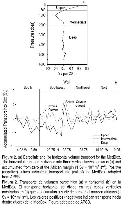 Para determinar y discutir correctamente los mecanismos de transporte (tabla 2) y la contribución de las diversas masas de agua (tabla 3) a los flujos biogeoquímicos no conservativos, es necesario conocer la estructura del transporte de volúmenes en la zona, la cual ha sido descrita a fondo en la sección 5 de APSB. La figura 2 muestra las componentes del transporte de volúmenes y destaca las características más importantes de la circulación en la región. La MW se forma como la mezcla de MOW de alta salinidad que sale por el Estrecho de Gibraltar y al hundirse arrastra ENACWs menos salinas hacia la profundidad, posteriormente se estabiliza a profundidades intermedias, y se dispersa en el Atlántico Norte. Estos procesos se reflejan en el perfil baroclínico de la circulación de renovación mostrado en la figura 2a; por consiguiente, los transportes serán divididos en los adscritos a la capa superior que corresponde a los primeros 500 dbar, una capa intermedia entre 500 y 2000 dbar y una capa profunda por debajo de esta profundidad. El balance total de volumen en la MedBox (tabla 3) muestra que el MW se produce con una tasa de 2.7 ± 0.2 Sv, que provienen de la transformación de 2.5 ± 0.2 Sv de ENACWs y de 0.2 ± 0.2 Sv de AA.