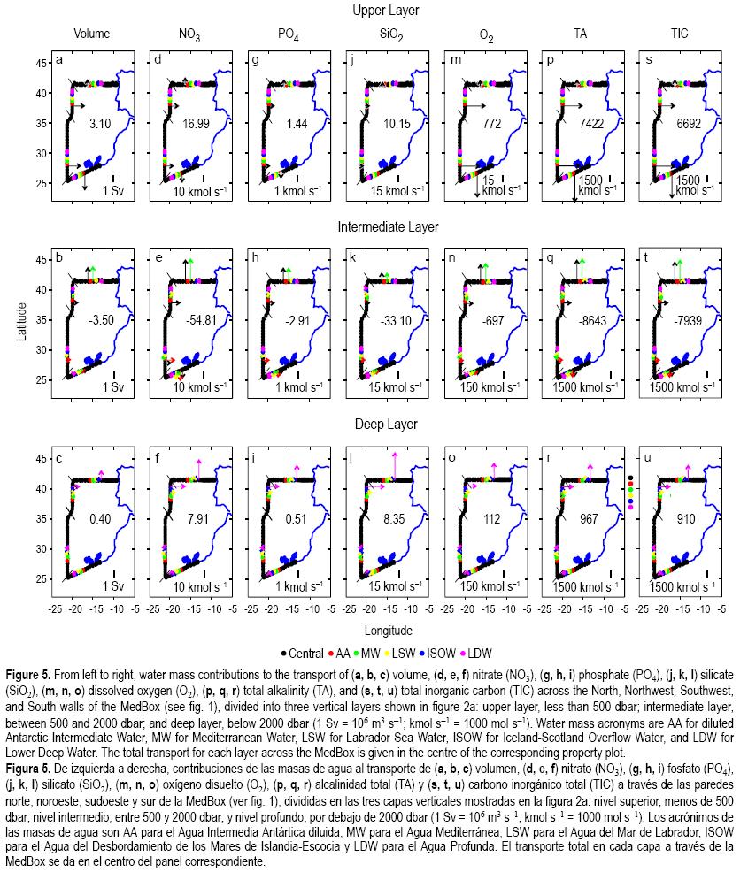 La distribución del transporte de TA y TIC asociado a las diversas masas de agua por pared y capa de agua (fig. 5pr, su) se asemeja su transporte de volumen correspondiente (fig. 5ac). La exportación más importante de TA y TIC hacia fuera de la caja ocurre en la capa intermedia (fig. 5q, t) a través de las paredes norte y sur, a través de la pared norte se atribuye al transporte de MW y ENACWs, y a través de la pared sur a ENACWs y AA con contribuciones de menor importancia de MW, LSW y LDW. La exportación en el nivel intermedio no es excedida por la importación en las capas superior y profunda.
