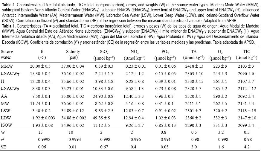 Las variables conservativas usadas fueron la temperatura potencial (θ) y la salinidad, y se supuso un comportamiento conservativo del silicato (SiO2). Los trazadores no conservativos fueron el nitrato (NO3), el fosfato (PO4) y el oxígeno disuelto (O2). Los procesos biológicos se modelaron en unidades de oxígeno. El consumo de O2 desde las condiciones iniciales cercanas a la saturación se convirtió en unidades de NO3 y PO4 usando los cocientes estequiométricos de Fraga et al. (1998). La ecuación lineal de mezcla para cada trazador se ponderó según el error analítico de la medida y de la variabilidad de su concentración en la zona de origen del tipo de agua (tabla 1).