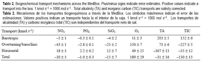 Los transportes a través de la MedBox se corresponden con la porción del Atlántico Norte enmarcado por los límites de la MedBox más el Mar Mediterráneo, ya que la caja MedBox está abierta en el Estrecho de Gibraltar. Los transportes totales a través de la MedBox se muestran en la tabla 2. Las sales nutrientes, la alcalinidad total (TA) y el carbono inorgánico total (TIC) se exportan hacia el Atlántico Norte, mientras que el O2 se importa desde el interior del océano. El mecanismo principal responsable de la exportación de nutrientes es la circulación de renovación (tabla 2), ya que la contribución barotrópica a la exportación es pequeña, y el componente horizontal implica una importación (tabla 2). Los perfiles lateralmente promediados a lo largo de la MedBox de NO3 y PO4 (fig. 3a, c) muestran una capa superior agotada en nutrientes (es decir, valores más pequeños que la media de toda la MedBox), mientras que en la capa intermedia la diferencia con esta media es pequeña. Estos perfiles baroclínicos de propiedades químicas, combinados con sus correspondientes transportes baroclínicos de volumen (fig. 2a) proporcionan los transportes de renovación. Un porcentaje alto de estos transportes ocurre en la capa superior (fig. 4a, c). El SiO2 presenta un perfil medio distinto al de NO3 y PO4 (fig. 3e): en los primeros 2300 dbar superiores el SiO2 es menor que la media de toda la sección, mientras que en la capa más profunda el SiO2 aumenta considerablemente debido a la mayor influencia de aguas profundas de origen antártico. El transporte de renovación o baroclínico de SiO2 (fig. 4e) muestra una capa superior donde éste se exporta hacia el océano a pesar de presentar valores más bajos que la media de la sección, mientras que en la capa intermedia se importa (figs. 2a, 3e, 4e). La circulación de renovación a profundidades intermedias transporta aguas relativamente empobrecidas en SiO2 hacia fuera de la caja, lo que se traduce en una importación de SiO2 hacia la MedBox