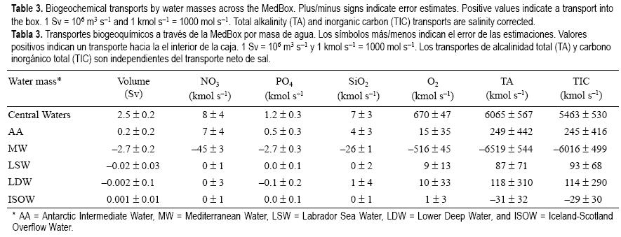 La tabla 3 muestra la contribución de cada masa de agua a los transportes de volumen y biogeoquímicos. El transporte de volumen atribuido a las aguas profundas es insignificante según las imposiciones del modelo inverso; por lo tanto, su contribución al transporte de nutrientes, O2, TA y TIC son pequeños y con una gran incertidumbre debido a los ajustes del modelo inverso. La formación de MW con una tasa de 2.7 ± 0.2 Sv y su transporte hacia el Atlántico Norte explica la exportación de nutrientes, TA y de TIC desde la MedBox hacia el Atlántico Norte. Como es de esperarse, el O2 se comporta de manera opuesta: la importación de ENACWs y AA contribuye a la ventilación de la MedBox.
