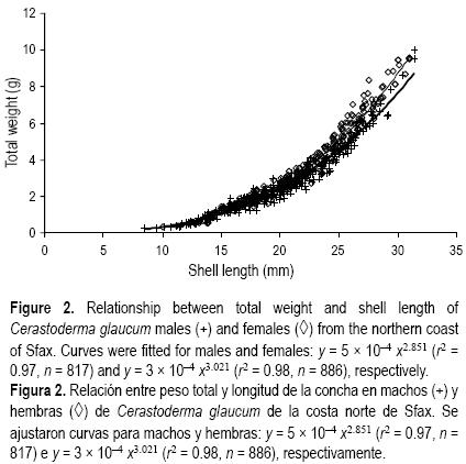 Durante un periodo de un año (enero de 2007 a diciembre de 2007) se muestrearon mensualmente aproximadamente 200 especímenes de C. glaucum de la costa norte de Sfax (Golfo de Gabes, sur de Túnez; fig. 1). En cada muestreo mensual, al momento de recolectar los especímenes también se registraron la temperatura y la salinidad del agua de mar. Asimismo, al inicio se registraron la longitud de la concha (LC, mm) y el peso total (PT, g) de cada espécimen de C. glaucum, utilizando para ello un calibrador digital (precisión de 0.01 mm) y una balanza digital de plataforma (precisión de 0.001 g), respectivamente. Se estimaron relaciones entre LC y PT por separado para cada sexo.