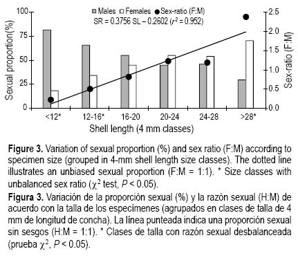 En el presente trabajo se encontró una razón de sexos balanceada estadísticamente en relación con la clase de talla, lo cual concuerda con estudios similares realizados con otras especies de moluscos como H. trunculus de España (Tirado et al. 2002) y Portugal (Paulo et al. 2008). Los machos predominaron entre los individuos de menor talla, mientras que las hembras lo hicieron entre los de mayor talla. Por lo contrario, Wolowicz (1984) sugirió que la razón de sexos en la población de C. glaucum no varía con la edad. Ansell (1961) también llegó a la misma conclusión al estudiar Venus striatula. Además, una especie de murícido (Bolinus brandaris) de España presentó una población sesgada hacia las hembras, pero la estructura de tallas fue similar para ambos sexos (Ramón y Amor 2002). En general las hembras son más comunes en poblaciones más viejas de moluscos gonocorísticos (Fretter y Graham 1964), y el incremento de esta proporción de hembras con la talla podría explicarse por el crecimiento diferencial entre sexos, en el que las hembras destinan mayor energía al crecimiento que a la reproducción.