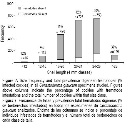 Al examinar los especímenes de C. glaucum se encontró que 15% estaban infestados por parásitos. Todos los individuos parasitados se encontraban infestados por tremátodos digéneos y la mayoría albergaba más de una especie de parásito. Las especies de tremátodos dominantes, los cuales principalmente se encontraron en adultos, fueron Gymnophallus choledocus, Labratrema minimus, Himasthla elongata y Psilostomum brevicolle. Las metacercarias de estas especies ocupaban gran parte de la masa visceral y las gónadas de los individuos. Los tremátodos mostraron una fuerte especificidad para los tejidos de órganos, encontrándose H. elongata casi exclusivamente en el pie, P. brevicolle y G. choledocus sólo en la masa visceral, y L. minimus en la glándula digestiva y gónada. El número de individuos infestados difirió con la clase de talla, y la prevalencia tendió a incrementar significativamente con el tamaño de los berberechos (prueba χ2, P < 0.05) (fig. 7).