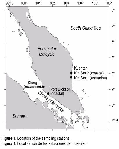 Se recolectaron muestras de agua de mar de diferentes tipos de ambientes litorales en el Estrecho de Malaca (aguas estuarinas de Klang [03°00.1' N, 101°23.4' E] y aguas costeras del Puerto Dickson [02°29.5' N, 101°50.3' E]) y el Mar de la China Meridional (Kuantan: aguas estuarinas en la estación 1 [03°48.4' N, 103°20.6' E] y aguas costeras en la estación 2 [03°48.7' N, 103°22.4' E]) (fig. 1). Para los análisis fisicoquímicos se realizaron de seis a doce muestreos durante un periodo de un año (tabla 1), mientras que el aislamiento bacteriano se llevó a cabo tres veces en cada sitio.