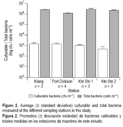 Las ufc mL1 medidas fueron de 0.23 a 1.85 x 103 y menores en la estación 2 de Kuantan (fig. 2). Los conteos bacterianos totales variaron de 1.04 a 3.29 x 106 cél mL1 y no reflejan las mediciones de ufc. El porcentaje de cultivabilidad resultó diferente para los diferentes sitios. En Puerto Dickson se cultivó un promedio de 0.12% de las bacterias totales, mientras que en Klang se cultivó un promedio de 0.06%. La razón de bacterias cultivables a bacterias totales fue menor en las dos estaciones de Kuantan (<0.05%).
