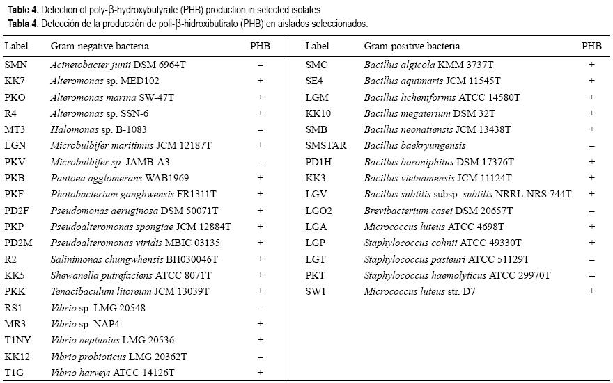 En la tabla 3 se presentan los resultados de la producción de enzimas extracelulares (i.e., lipasa, amilasa y proteasa). La amilasa resultó la más prevalente, encontrándose en 56% (n = 28) de los aislados examinados, mientras que sólo 36% (n = 18) y 18% (n = 9) de éstos mostraron actividad proteasa y lipasa, respectivamente. La presencia de amilasa es común en los géneros Bacillus, Pseudoalteromonas y Vibrio. La proteasa se encontró en la mayoría de las especies de Micrococcus, Pseudoalteromonas y Shewanella, mientras que la lipasa sólo se observó en algunas especies de Staphylococcus y Vibrio. En contraste, la producción de PHB se observó en la mayoría de los aislados examinados (>70%, n = 26) (tabla 4).