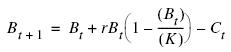 donde t = tiempo (temporada de pesca), Bt = biomasa de la población al tiempo t, Bt+1 = biomasa de la población al tiempo t + 1, r = tasa intrínseca del crecimiento de la población, K = tamaño de la biomasa virgen o capacidad de carga, Ct = captura al tiempo t.