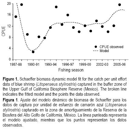 Dentro de la zona de amortiguamiento de la Reserva de la Biosfera del Alto Golfo de California y Delta del Río Colorado (establecida en junio de 1993), la pesquería de camarón se administra como un recurso de uso común y racional, tratando de que el esfuerzo pesquero impacte lo menos posible tanto al recurso como al ecosistema. Se analizaron posibles cuotas de captura estimando el rendimiento esperado y la biomasa futura de camarón mediante un modelo dinámico que usó la temporada de pesca como factor (denominado periodo), y la captura por unidad de esfuerzo (CPUE) como índice de abundancia. La CPUE de L. stylirostris declinó en la temporada 1990/91, tendiendo a la recuperación en 1995/96. Los parámetros del modelo dinámico de biomasa fueron K = 21,323 t (±700 t, P < 0.05) y r = 1.18 (±0.1, P < 0.05). La capturabilidad estimada fue de 0.00032 con una desviación estándar de 0.25. Se proyectó la biomasa con tres escenarios de cuota de captura dentro de la zona de estudio. Dada la utilidad de establecer un límite anual a la captura de biomasa disponible para la administración del recurso, y de acuerdo a los escenarios analizados, se propone la adopción de las cuotas de 2200 y 2400 t por una temporada de captura, y evaluar su efectividad al término del mismo.