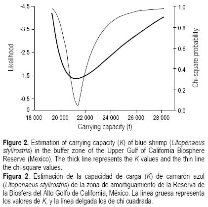 El ajuste del modelo dinámico de biomasa a los datos de CPUE muestra que es posible identificar dos periodos. el primero de 1988/89 a 1993/94 con un ajuste adecuado; y el segundo de 1994/95 a 2006/07, que no fue descrito de forma adecuada por el modelo (fig. 1) mostrando gran variabilidad de la CPUE. Los parámetros del modelo dinámico de biomasa fueron K = 21,323 t (con intervalo de confianza de ±700 t, P < 0.05) (fig. 2), y r = 1.18 (con intervalo de confianza de ±0.1, P < 0.05).