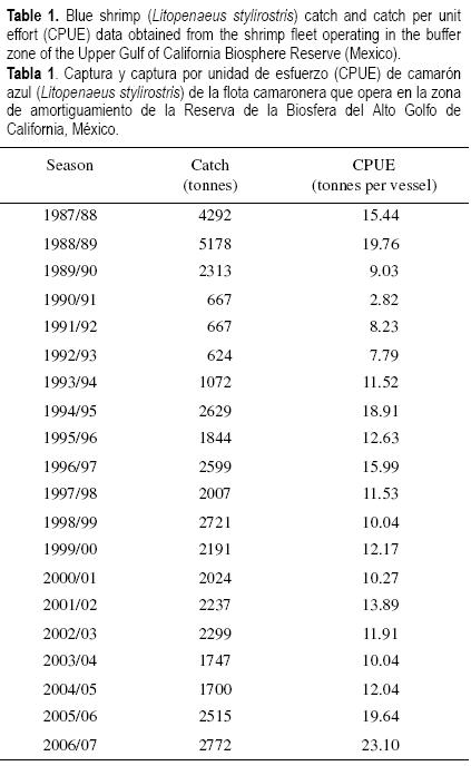 Los datos de captura anual (toneladas, peso vivo) y la CPUE (toneladas por barco) fueron obtenidos de los registros oficiales provenientes de la flota camaronera de arrastre de Puerto Peñasco y el Golfo de Santa Clara, Sonora y San Felipe, Baja California de 1987/88 a 2006/07 (tabla 1). Se analizó la información considerando los periodos anuales de la temporada de pesca, aproximadamente de septiembre a mayo (Rodríguez de la Cruz 1976 and MagallónBarajas 1987 in MoralesBojórquez et al. 2001) aunque en algunas temporadas se acortó este periodo. La captura total se separó por especies con la información de las plantas procesadoras de camarón en los puertos mencionados y para este estudio se utilizó sólo la captura de camarón azul en peso vivo.