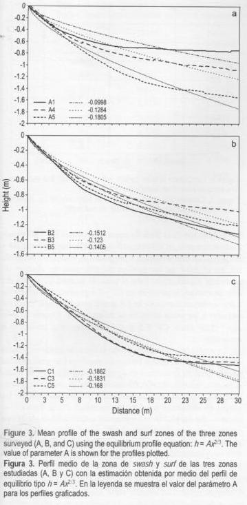 Los valores del parámetro A de los perfiles medios se muestran en la tabla 3. Se observa que los valores de este parámetro estuvieron entre 0.1863 y 0.904, y que sus mayores valores se presentan en perfiles someros o de acumulación, que corresponden a perfiles cercanos a la escollera de Chuburná (A1, A2 y A3). Respecto a la variación de A en relación a las épocas climáticas, se observó consistentemente que los menores valores se presentan en época de Nortes. En la figura 3 se observan los perfiles medios obtenidos con las estimaciones del perfil de equilibrio tipo h = Ax2/3. En la zona A se observa mayor heterogeneidad entre perfiles, en la que los cercanos a la escollera de Chuburná, en el extremo oeste, presentan pendientes más suaves en relación al perfil A5 localizado en el extremo oriental de esta zona. Los perfiles de la zona B son más homogéneos entre sí, con pendientes intermedias. Los perfiles de la zona C muestran pendientes más pronunciadas.