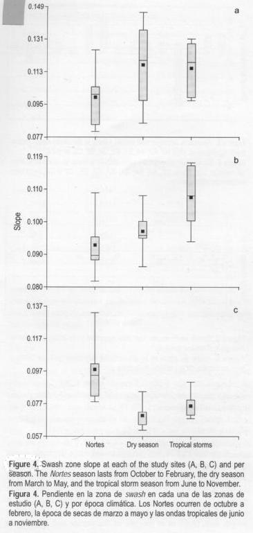 Como lo muestran las desviaciones estándares de los perfiles medios de playa, esta zona es la más dinámica. En la figura 4 se observa cómo en ondas tropicales se presentan los promedios más altos de la pendiente, mientras que en temporadas de Nortes los valores son menores. Si bien esto generalmente es cierto, se puede apreciar que las pendientes en las zonas A y B tienden a ser menores durante la época de Nortes en contraste con la época de ondas tropicales; sin embargo, en la zona C este comportamiento se invierte.