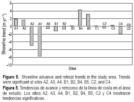 El análisis de la posición de la línea de costa a lo largo del tiempo muestra que en la zona A (fig. 5), en los perfiles A3 y A4 ésta tiende a retroceder significativamente, en particular en el sitio A4 con una tasa de 7.76 m año1; mientras que en los perfiles A1 y A2 se observa una tendencia a incrementar el ancho de playa. En la zona B, de Puerto Progreso, se observa que la posición de la línea de costa en los sitios B1 y B2 tiende a retroceder pero en B3 se mantiene estable, mientras que B4 y B5 presentan una tendencia a progradar. A excepción del perfil B3, en el resto de los perfiles de esta zona se observa un tendencia significativa. Para el caso de la zona C, al este del área de estudio, la posición en C2 y C4 presenta una tendencia a retroceder, en particular en C4 donde esta tendencia es mayor respecto a los otros sitios de la misma zona, a razón de 2 m año1. Los sitios C1, C3 y C5 muestran una tendencia a progradar.