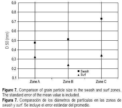 A partir de las fracciones tamizadas de material sedimentario se obtuvieron los percentiles que permitieron estimar la media, mediana, desviación estándar (dispersión o sorteo), asimetría y kurtosis (tabla 4). En general, y de manera homogénea, la arena en la zona de swash se clasificó como arena gruesa, mal clasificada, casi asimétrica y mesocúrtica. La variación entre arena gruesa a media es relativamente homogénea a lo largo de los sitios muestreados y sin ningún gradiente aparente. Consistentemente el tamaño de arena en la zona de swash es mayor que el de la zona de surf (fig. 7). El material que permanece en la zona de swash está constituido por fragmentos de conchas de moluscos entre los que dominan las formas de plato.