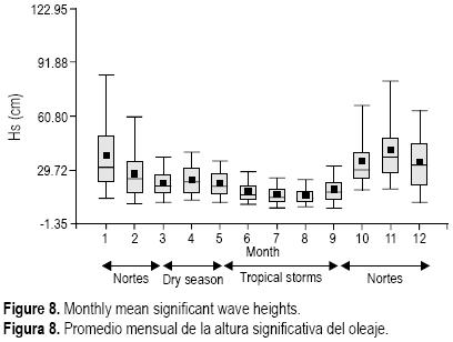 Durante el período de operación del sensor de oleaje se obtuvieron 15,824 datos, determinándose una altura media de ola significativa (Hs) de 24.19 cm, con una desviación estándar de ±16.15 cm, una moda de 11.40 cm y un rango de 0.5 a 143 cm. La media del período de ola significativa (Ts) fue de 3.55 s, con una desviación estándar de ±2.04s, una moda de 2.40 s y con un rango de 0.60 a 15.0 s. La longitud de ola significativa fue de 16.65 m en el sitio del instrumento y en aguas profundas (Lo) se estimó en 17.62 m. La celeridad de la ola se estimó en 4.96 m s1 en el sitio de muestreo y de 5.25 m s1 en aguas profundas. Se observó que las olas más altas y de mayor período se presentan en la temporada de Nortes (fig 8).