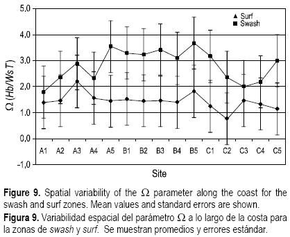 En general los sitios estudiados se clasificaron como playas intermedias; sin embargo, la zona de swash presentó valores de Ω menores a los de la zona de surf, acercándose a los límites de playas reflectivas, esto, como resultado del efecto del tamaño de partícula ante condiciones iguales de oleaje. Si bien para toda la costa se emplearon las mismas condiciones de clima de oleaje,Ω muestra una variación a lo largo de la costa (fig 9), así como también a lo largo del tiempo, como se ejemplifica en la figura 10 donde se muestra la variabilidad temporal del parámetro en el sitio A1.