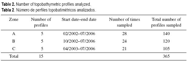 Con base en los estudios de perfiles propuestos por Bernabeu et al. (2003), se caracterizaron perfiles de playas en función de algunos descriptores fisiográficos a partir de los promedios en las diferentes épocas del año. Se empleó un levantamiento topográfico (Bannister et al. 2002, Compton 1985) bimestral de febrero de 2002 a julio de 2006 utilizando un nivel óptico, iniciando las mediciones del perfil en la zona de duna, o bien, al frente de alguna propiedad o construcción, y extendiéndolas a la zona sumergida hasta donde el estadal puede ser sostenido por una persona de pié. Generalmente este límite en la zona sumergida comprende la rompiente de ola, lo que permite registrar la zona de surf. La distancia de muestreo a lo largo de cada perfil fue sistemáticamente de aproximadamente 3 m entre cada dato. Adicionalmente se registraron los rasgos fisiográficos sobresalientes como escarpes de dunas y otros cambios abruptos que se encontraban. Para comparar los perfiles en el tiempo, cada perfil se inició desde una referencia cuya posición geográfica y altura ortométrica fueron determinadas con un sistema de posicionamiento global diferencial. Los 15 perfiles utilizados en el trabajo se distribuyen de acuerdo con la figura 1. Los cinco sitios en las playas de Chuburná (Zona A) tienen una separación aproximada de 1500 m entre ellos, los de las playas de Puerto Progreso (Zona B) 350 m, y los localizados en las playas de Uaymitún (Zona C) de 1500 m. Las características de las series de datos analizadas y presentadas en este estudio se muestran en la tabla 2. Se analizó un total de 365 perfiles a lo largo de aproximadamente 35 km de playas, en los que se presentan celdas y subceldas de transportes cuyos límites se encuentran definidos por infraestructuras portuarias y la propia configuración costera. Para estimar el perfil medio, la desviación estándar y la pendiente en la zona de swash, los datos de altura fueron interpolados linealmente a un intervalo constante. Se determinó el parámetro de forma A de la expresión del perfil de equilibrio propuesta por Bruun (1954) y Dean (1977) tipo h = Ax2/3. Dicho parámetro de forma fue estimado con una regresión para cada perfil medio y para cada temporada climática. El estudio de tendencia erosiva/ acumulativa en los perfiles está basado en el seguimiento en el tiempo de la posición de la línea de costa. La referencia a la línea de costa fue definida como la altura cero ortométrica.
