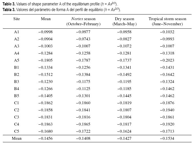 El parámetro de forma A en el modelo de Dean obtenido de la regresión de perfiles medios recoge consistentemente la heterogeneidad espacial observada en estos perfiles y de forma similar los cambios observados en las temporadas climáticas. Durante la temporada de Nortes, el promedio de A fue de 0.1408 modelando un perfil suave que durante la temporada de ondas tropicales mostró un promedio de 0.1534 para un perfil de mayor pendiente. Sin embargo, este modelo se aparta de las formas reales de los perfiles medios, mostrando diferencias importantes al no reproducir la caída relativamente abrupta al inicio y el posterior suavizamiento del perfil. En este sentido es necesario identificar el modelo que mejor represente el comportamiento de la zona.