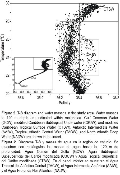 Como se observa en el diagrama TS de la capa superficial de 120 m en el área de estudio (fig. 2), el CTSW y el CSUW son modificadas en el Golfo de México. La masa de CTSW modificada se caracteriza por intervalos de temperatura de 28 < T < 30°C, y de salinidad de 36.4 < S < 36.8, mientras que la masa de CSUW modificada tiene 22 < T < 26°C y 36.4 < S < 36.6. También se puede observar en el diagrama TS el GCW, de 36.2 < S < 36.4, y con un amplio intervalo de temperatura de 22 < T < 28°C (fig. 2).