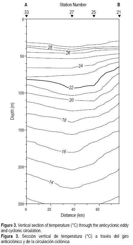 La temperatura superficial en la región fue ~29.5°C, mientras que a 120 m de profundidad fue de 18.5°C. El piso de la capa de mezcla se localizó a ~35 m de profundidad. Por debajo de la termoclina, la forma de las isotermas revela una configuración típica de un núcleo calido cerca de la estación 27 (fig. 3). La salinidad varió de 36.5 en la superficie del mar a 36.4 a 120 m de profundidad y σθ de 23 kg m3 en la superficie a 26 kg m3 a 120 m. Por debajo del piso de la termoclina, a 50 m de profundidad, se observaron las mismas características hidrográficas hasta profundidades mayores a 200 m. De acuerdo con lo antes mencionado, la profundidad de 50 m fue adecuada para el análisis de masas de agua ya que la temperatura y la salinidad se ajustan a la distribución de las masas de agua subsuperficiales del golfo, y muestran mejor su estructura dinámica.