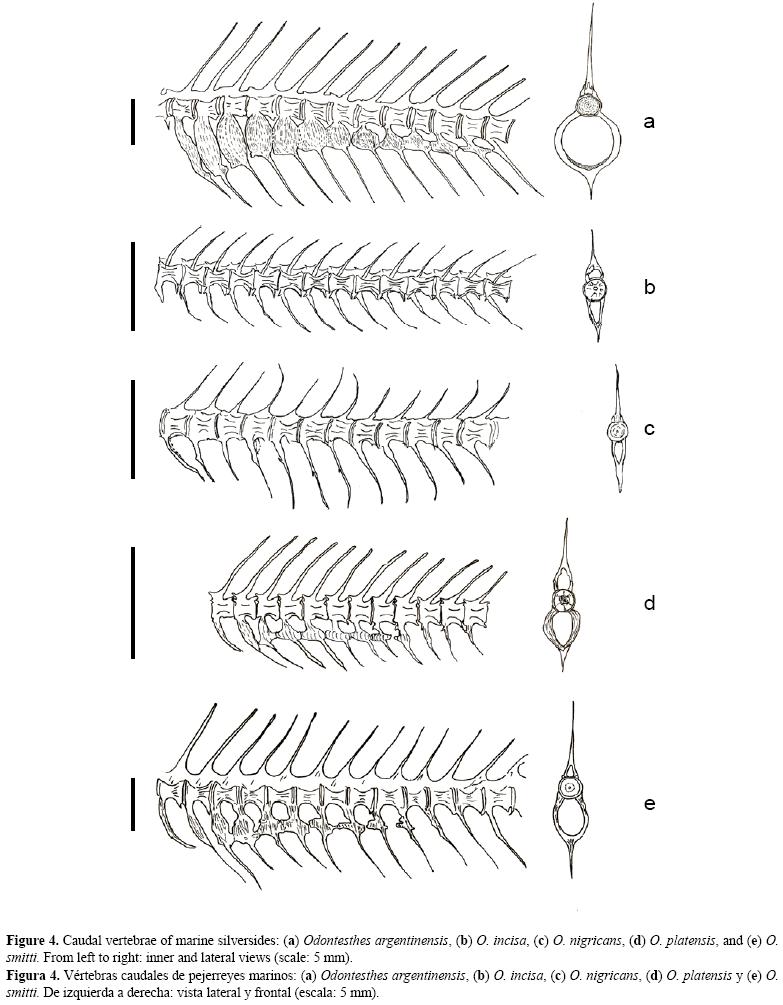 La morfología de los arcos hemales de las especies estudiadas coincide con las descripciones de Piacentino y Torno (1987). Sin embargo, el número de vértebras totales y el número de vértebras en cada región difiere de lo obtenido por Piacentino (1990) y por Cousseau et al. (2004). Esta diferencia estaría explicada por la variabilidad merística debida al amplio ámbito latitudinal de las especies. De hecho, se halló que el número de vértebras en especies de Odontesthes aumenta con la latitud (Dyer y Gosztonyi 1999).