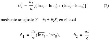 donde U es la componente de velocidad a lo largo del golfo, i indica las celdas de velocidad que se incluyen en el ajuste, y la barra superior indica el promedio sobre dichas celdas. Los intervalos de confianza para u* y z0 se obtuvieron en función del coeficiente de correlación R, siguiendo el método descrito por Wilkinson (1984) y Lueck y Lu (1997).