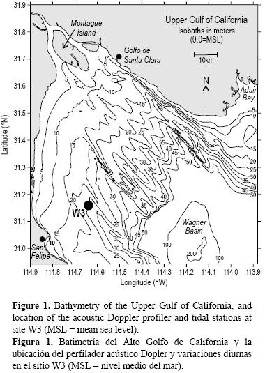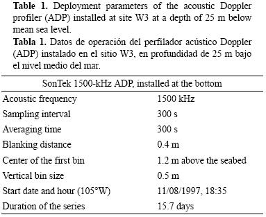 Se midieron perfiles de velocidad durante 15 días en un sitio de la parte oeste del Alto Golfo mediante un correntímetro perfilador Doppler (Sontek ADP) instalado en una placa de 0.8 m2 fija en el fondo. El sitio (W3, fig. 1) se ubicó 15 millas náuticas al NE de San Felipe, en profundidad de 25 m con respecto al nivel medio del mar. El instrumento se ubicó entre dos bajos casi paralelos, en una depresión longitudinal de 10 km de ancho con sedimento superficial consistente de limos muy finos (Φ > 7), mal clasificados (Carriquiry y Sánchez 1999). La placa de montaje del ADP permaneció horizontal y estática, de acuerdo con los ángulos de los sensores de orientación. El instrumento grabó promedios consecutivos de la velocidad medida a 1 Hz, durante intervalos de 5 min, en celdas cada 0.5 m, entre 1.2 y 16 m del fondo (tabla 1). Adicionalmente se obtuvieron datos hidrográficos mediante lances de CTD cada 0.5 h durante uno y cuatro periodos semidiurnos en mareas muertas y mareas vivas, respectivamente. Se midió la concentración de sedimento en suspensión con dos nefelómetros OBS calibrados con muestras de agua del Alto Golfo; uno instalado en el CTD y otro anclado a 1 m del fondo.