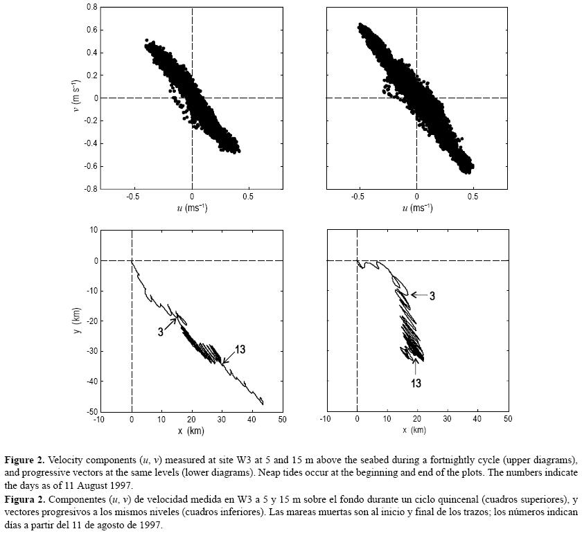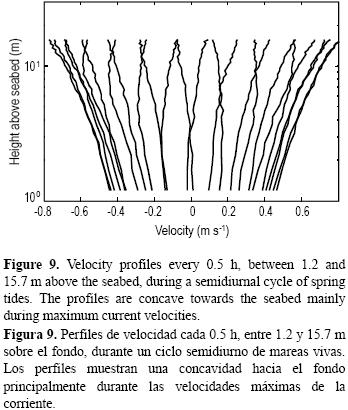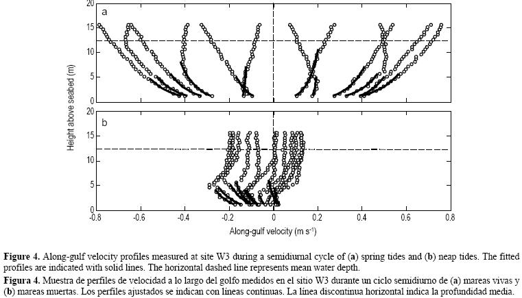 Al aproximarse el cambio de sentido de la corriente la capa logarítmica fue muy delgada o inexistente y los valores de R fueron menores a 0.95. La figura 4 muestra perfiles de velocidad y sus ajustes durante dos ciclos semidiurnos en mareas vivas y en mareas muertas. En estas últimas se observa que el cambio de sentido de la corriente de marea se anula cerca del fondo, tanto al inicio como al final del ciclo quincenal, generándose un flujo neto hacia fuera del Alto Golfo (velocidad negativa) en una capa de 7 a 8 m de espesor próxima al fondo. El flujo neto se observa también en el diagrama progresivo de vectores de la corriente a 5.2 m sobre el fondo (fig. 2). Esta condición contrastante, atribuida a una corriente de gravedad, se observó durante 46 ciclos semidiurnos, con velocidad de hasta 0.3 m s1 en el núcleo centrado a 46 m sobre el fondo. Se obtuvieron algunos ajustes válidos de perfil logarítmico en una capa delgada bajo el núcleo de la corriente de gravedad.