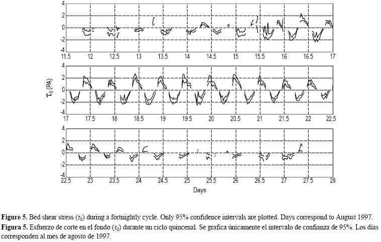 La magnitud de τ0 es consistente con las condiciones macromareales que prevalecen en el Alto Golfo y es similar a las magnitudes obtenidas en regiones con rangos de marea similares y corrientes máximas cercanas a 1 m s1 (Lueck y Lu 1997, Elliott 2002). Los marcados picos cuartidiurnos de τ0 son casi simétricos durante las mareas vivas y muestran la notable influencia de la marea. En contraste, durante mareas muertas los picos cambiaron a semidiurnos y generalmente negativos. Este cambio se atribuye a la formación de corrientes de gravedad que fluyeron hacia fuera del Alto Golfo, cerca del fondo. Dichos eventos se han descrito por Lavín et al. (1998), con base en corrientes e hidrografía, y por Alvarez y Jones (2002) al analizar flujo de sedimento en suspensión. Los eventos ocurrieron durante los dos muestreos de mareas muertas y produjeron un esfuerzo promedio en el fondo dirigido hacia fuera del Alto Golfo, consistente con el sentido del flujo neto. Más detalles sobre las condiciones de mareas muertas se analizan al final de esta sección.