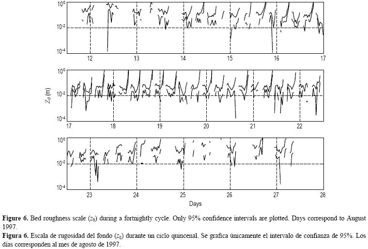 El parámetro de rugosidad del fondo fue menor que 0.05 m durante la mayor parte de la serie quincenal (fig. 6). La media de z0 en mareas vivas fue 0.06 m (DE = 0.11 m) mientras que la media de mareas muertas fue 0.16 m (DE = 0.14 m). La moda (0.020.03 m) es mejor valor estadístico en virtud de la marcada asimetría de la distribución. La figura 6 muestra que los mayores valores de z0 y los más amplios intervalos de confianza se obtuvieron durante mareas muertas.
