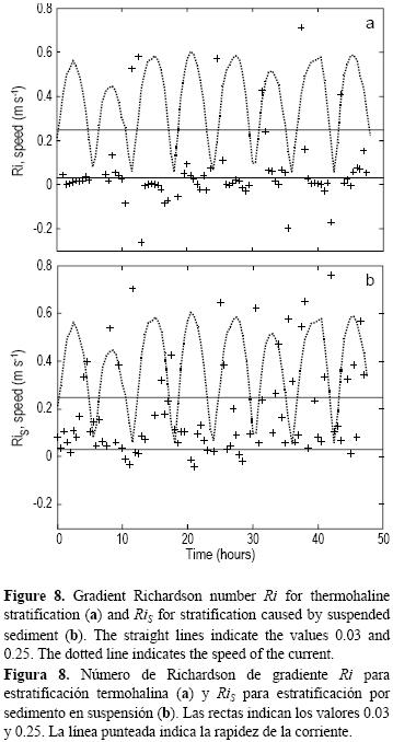 Green y McCave (1995) analizaron observaciones con ADCP en condiciones similares a las de este trabajo y atribuyeron la gran variación de z0 a la estratificación causada por la alta concentración de sedimento en suspensión cerca del fondo. Dadas las altas concentraciones de sedimento en suspensión y la estratificación en mareas muertas observadas en el Alto Golfo, se usaron las series de perfiles obtenidos en el sitio W3 durante las variaciones diurnas para evaluar el posible efecto sobre la mezcla vertical y el perfil de velocidad. Se calcularon los números de Richardson de gradiente:
