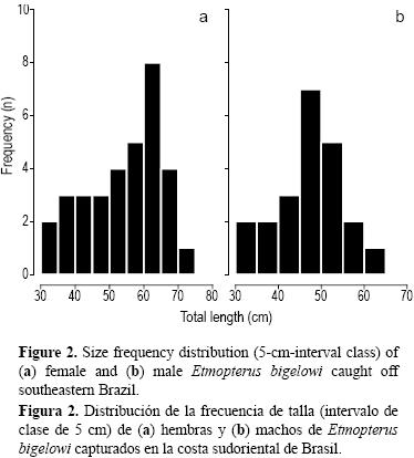 Krefft (1968) observó E. pusillus (posiblemente identificaciones erróneas de E. bigelowi según Shirai y Tachikawa 1993) en aguas del Atlántico sudoccidental, y registró una LT de 16.9 a 66.6 cm para machos y de 19.4 a 64.6 cm para hembras. Más recientemente, Gianetti y Vooren (2008) analizaron 88 especímenes de E. bigelowi capturados en aguas del sur de Brasil, con una LT de 7.4 a 66.6 cm. Según Compagno et al. (2005), las hembras de E. bigelowi pueden alcanzar tallas mayores que 67 cm LT; en el presente estudio, la hembra de mayor tamaño fue de 73 cm LT. En nuestra muestra, las hembras alcanzaron mayores tallas que los machos, un patrón de dimorfismo sexual que parece ser común en tiburones escuálidos (e.g., Yano y Tanaka 1988, Coelho y Erzini 2008a).
